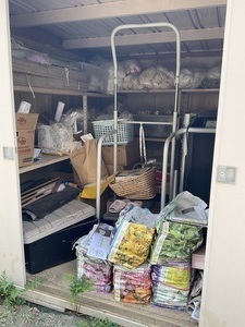 長年使われていなかった物置の中には、園芸用の土や肥料の袋、折りたたみラック、電化製品の箱、日用品などが床いっぱいに積み重なり、必要な物を取り出すのも一苦労という状態でした。併設の倉庫スペースも、いつの間にか使わなくなった生活用品や小物類の一時置き場になってしまい、「どこから手をつけていいか分からない」とご相談をいただきました。